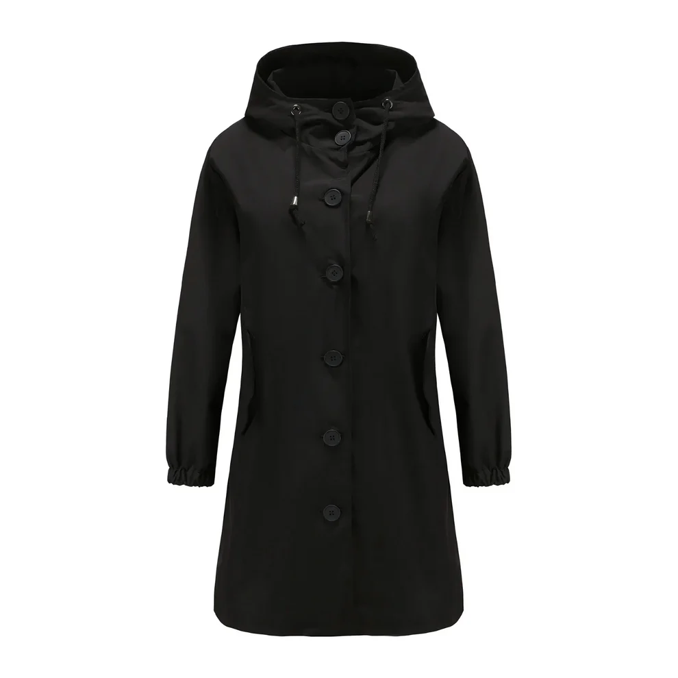 Stijlvolle damescape met capuchon en knoopsluiting