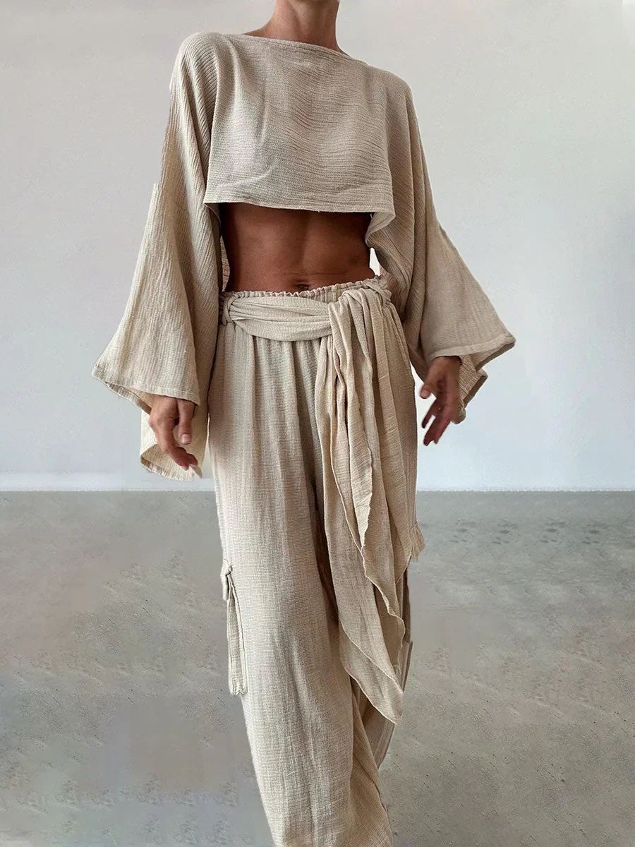 Deze set combineert een frisse uitstraling met een moderne stijl. Het cropped topje met wijde mouwen voegt een speels accent toe, terwijl de rechte broek zorgt voor een klassieke balans. Een complete outfit die stijl en klasse uitstraalt.